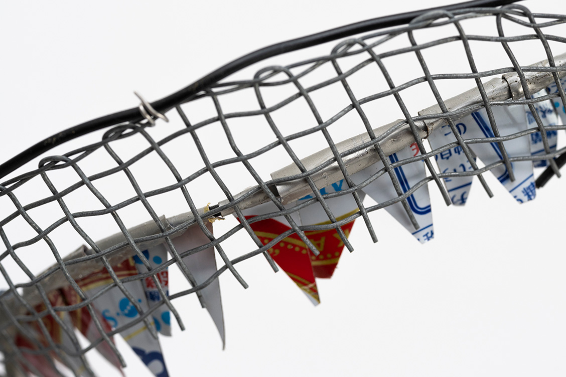 翼の後ろ側。小さく切ったアルミ缶の端を曲げて、針金にひっかけてつなぎ合わせている。